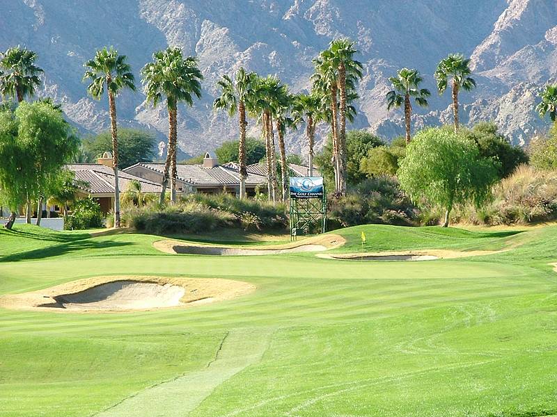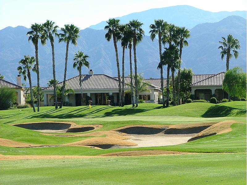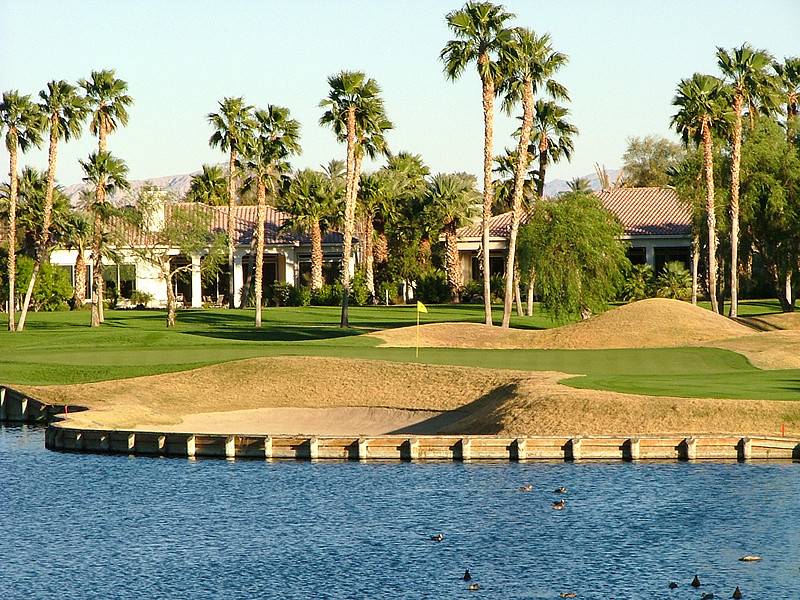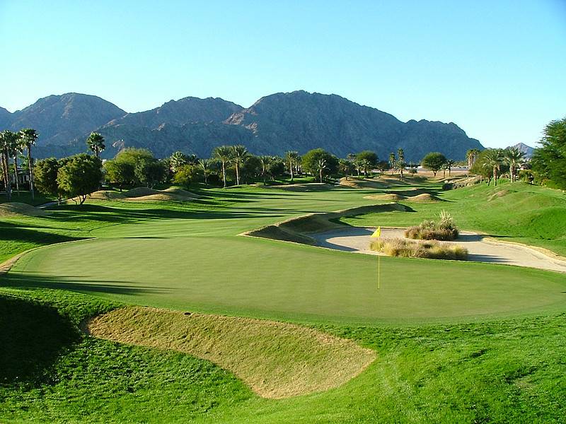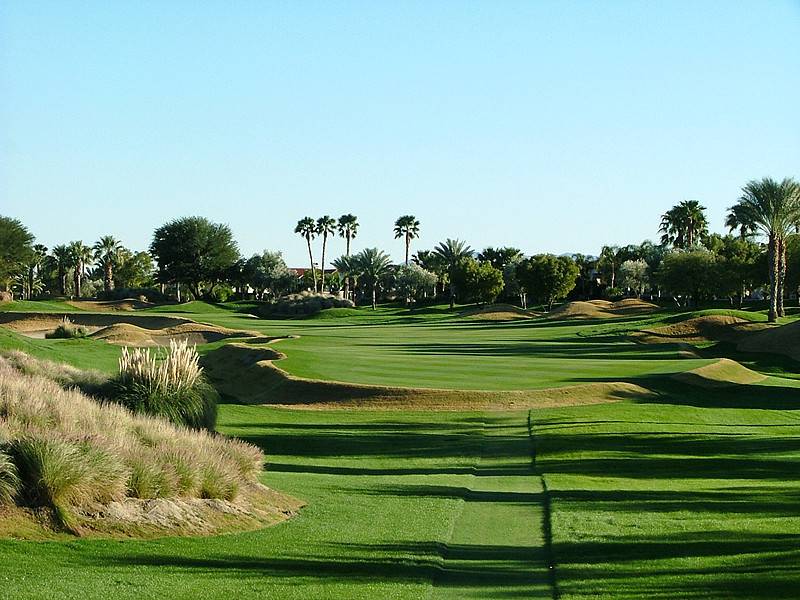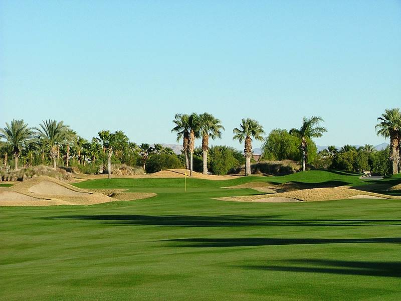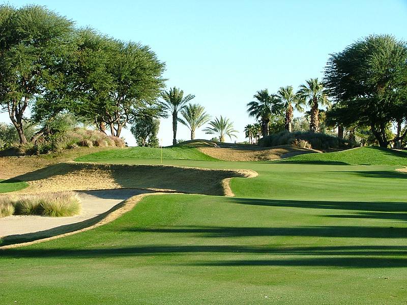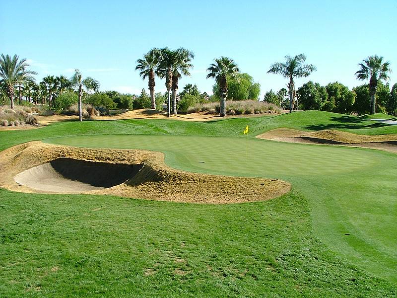 Hole 13 • Second Shot — Typical Nicklaus desert 'elevated' green with deep guarding bunkers; missing short leaves a difficult recovery.