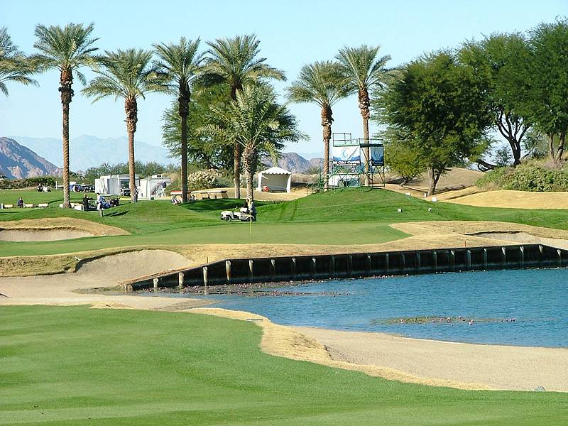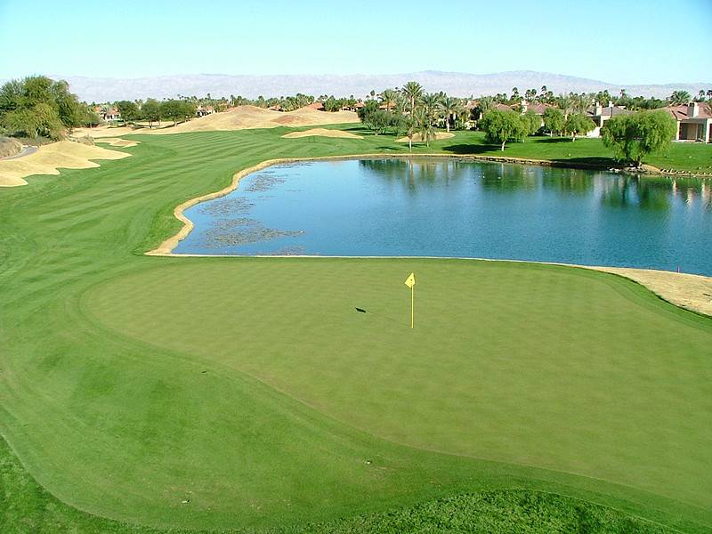 Hole 16 Par 4– Water carry not a big issue but good visual threat for most angle necessary depending on pin location